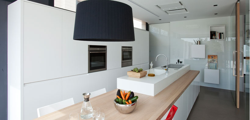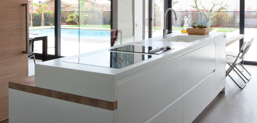 Se alternan las ideas claras del cliente junto con las propuestas innovadoras. El mobiliario se concibe como una autèntica obra de arte que nace de la combinación del fino lacado satinado con la pureza del Corian dando la máxima calidad a un acabado sedoso y elegante que conserva su belleza con el tiempo.