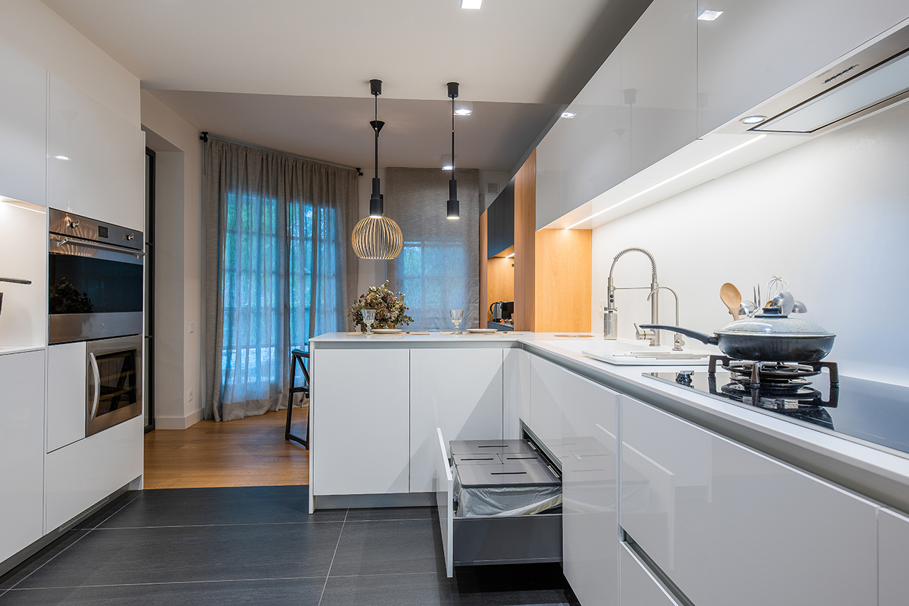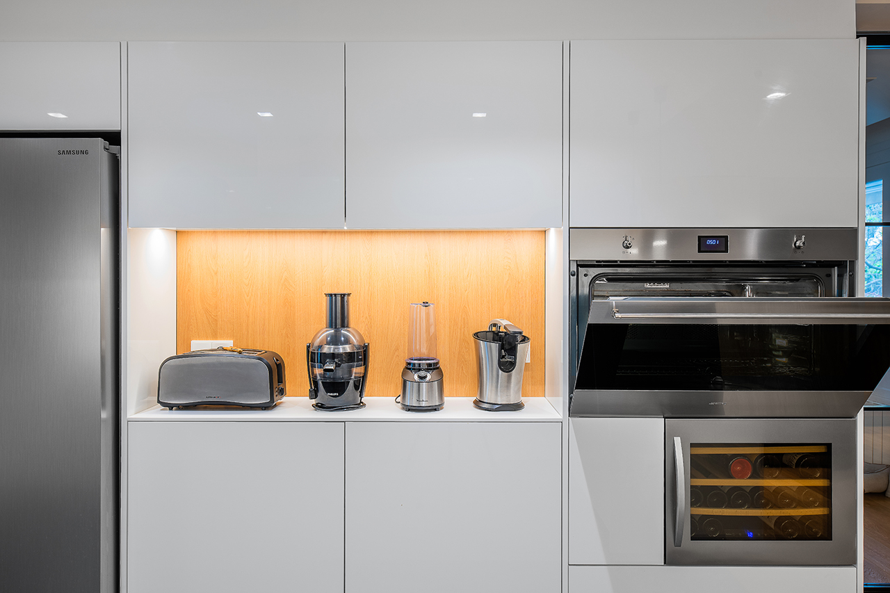 Cocina independiente compuesta por una amplia zona de columnas, equipadas con todos los electrodomésticos indispensables para una gran cocina, y una amplia zona, para los pequeños electrodomésticos.