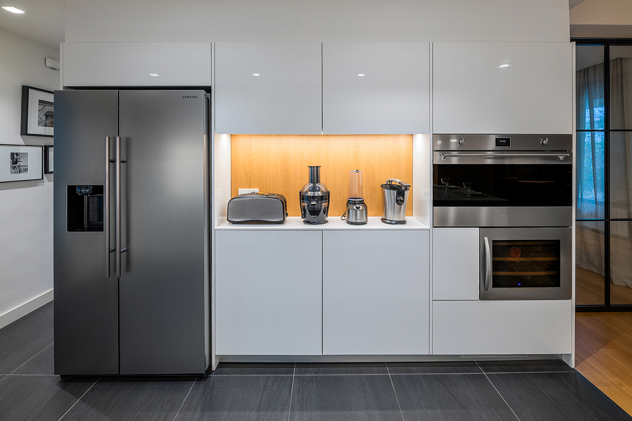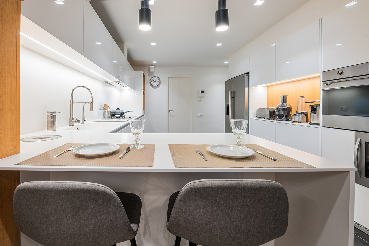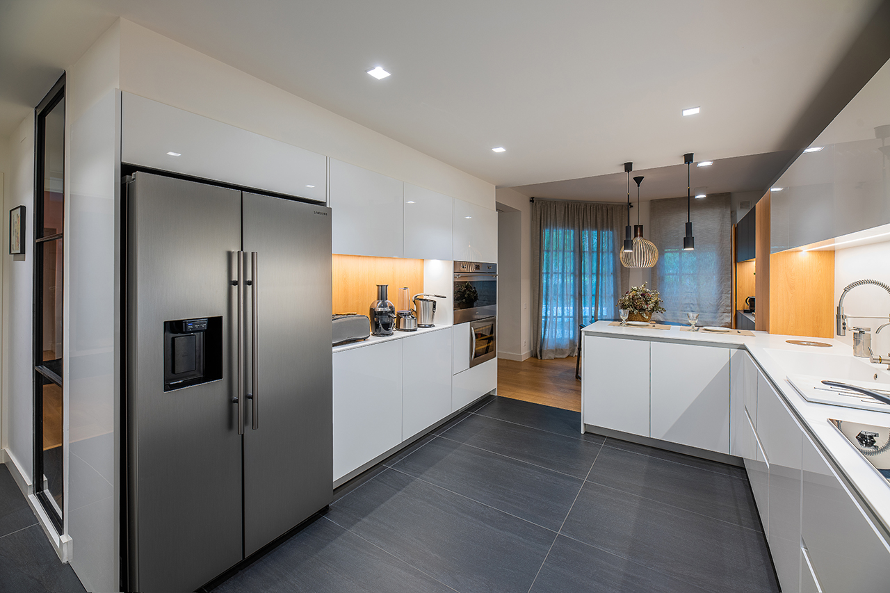 Paralelamente encontramos la zona de cocción y lavado, donde la separación entre la cocina y parte de la zona de menaje, se ha realizado mediante una barra, para separar los dos ambientes, donde el blanco de los muebles de la cocina, hacen que el espacio esté lleno de luminosidad.