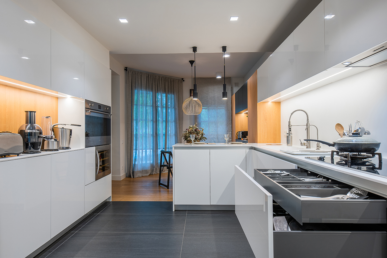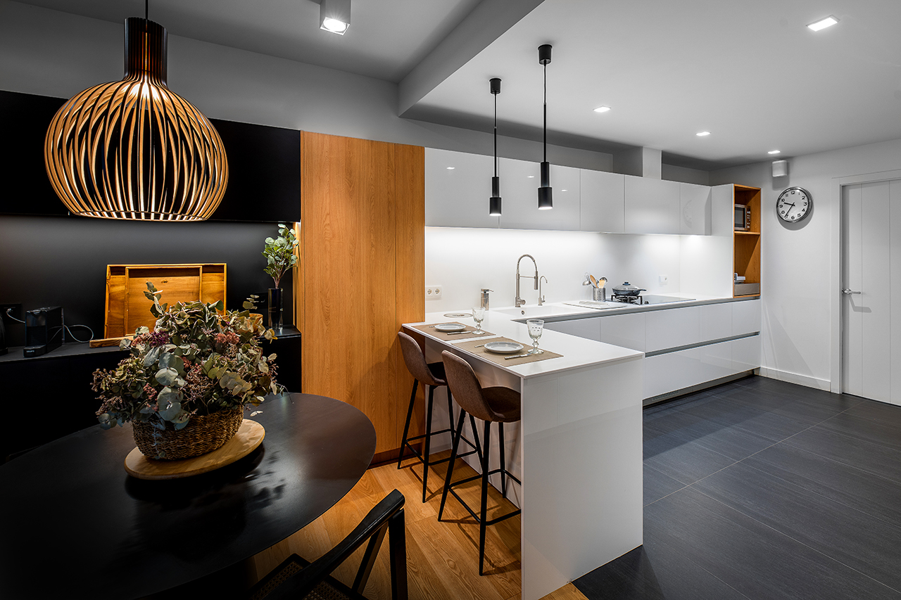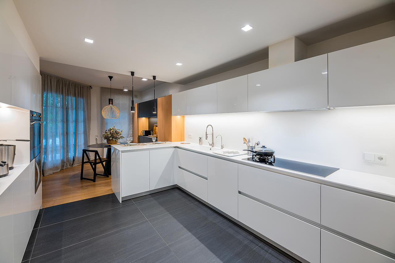 Paralelamente encontramos la zona de cocción y lavado, donde la separación entre la cocina y parte de la zona de menaje, se ha realizado mediante una barra, para separar los dos ambientes, donde el blanco de los muebles de la cocina, hacen que el espacio esté lleno de luminosidad.