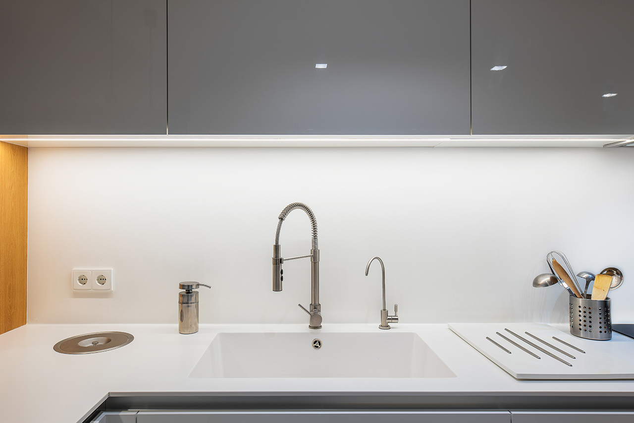 En la zona de trabajo se ha empleado corian, que a la misma vez se une con la barra. Dándole una perfecta continuidad de una sola pieza.